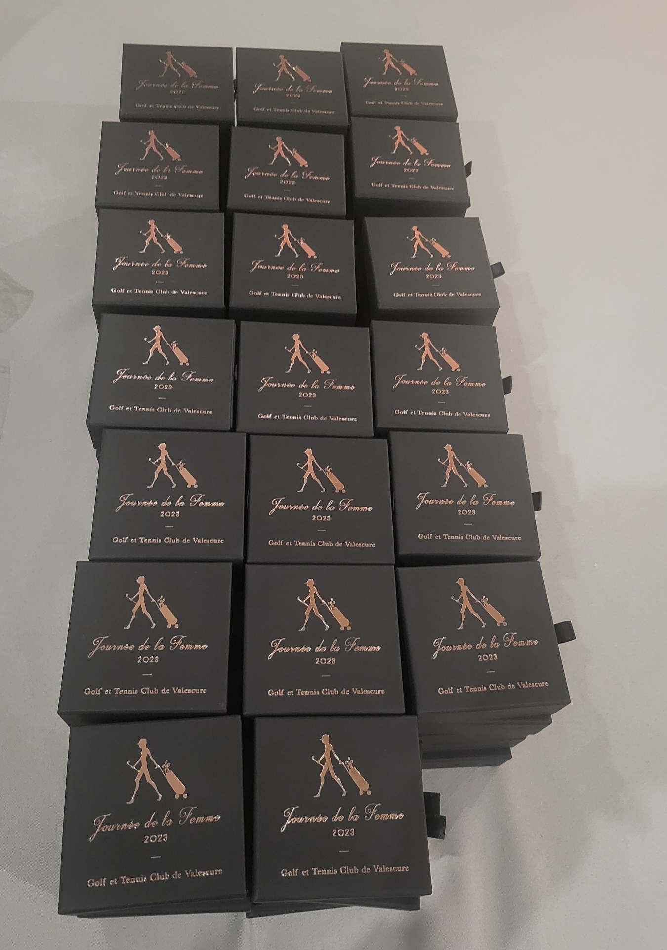 Nina by Gordon vous fait le marketing adapté à votre évènement : Boîte ou pochette imprimées au logo de votre entreprise ou évènement, médaille bijoux gravée avec votre logo ou inscription de votre choix, etc...